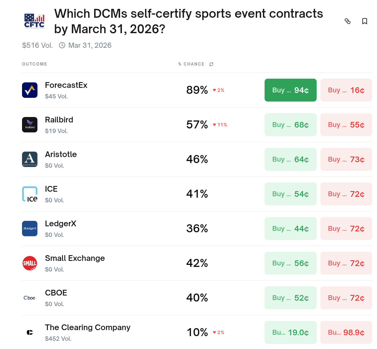 A meta-market on Polymarket: “Which DCMs self-certify sports event contracts by March 31, 2026?” Many Polymarket partnerships. Domah, a top Polymarket trader, was on 60 mins. And you can now do derivatives off Polymarket markets.