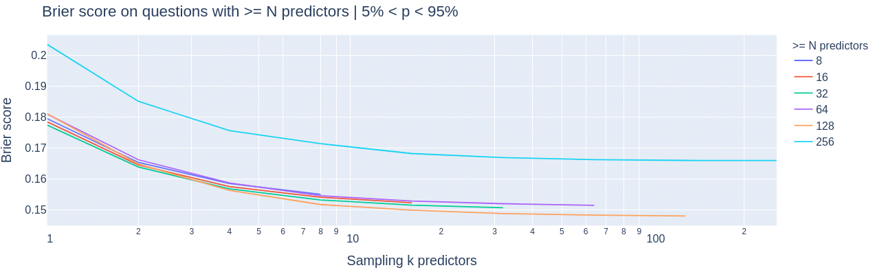 Charles Dillon of Rethink Priorities and SimonM look at How does forecast quantity impact forecast quality on Metaculus? (a). More forecasters increase forecast quality, but the effect is small beyond 10 or so forecasters.